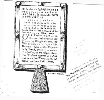 "On the paper were usually the alphabet, the Benediction, the Lord's Prayer, and the Roman numerals.
